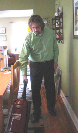 Does it help that Steve’s wearing a button-down shirt and nice pantaloons? I must say I never dress so well when I clean. Lessons to be learnt in bachelor-land, I guess.