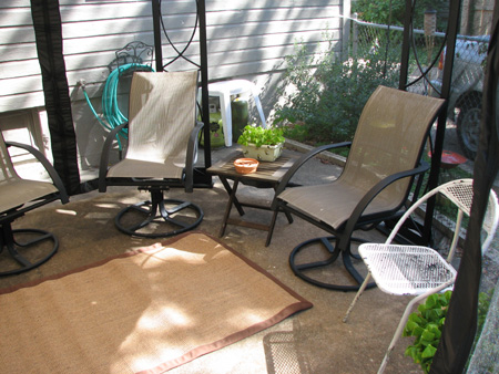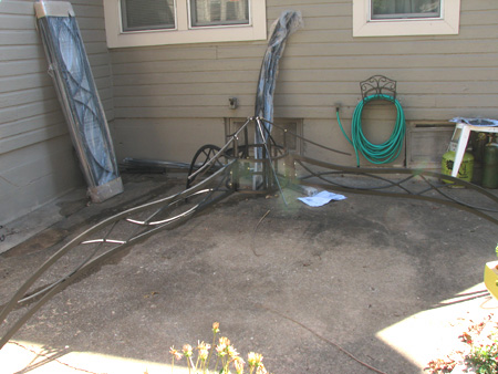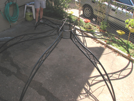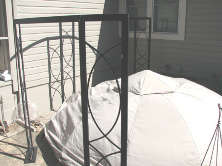 I guess the couple that does projects together stays together – or maybe they end up facing each other across the table, lawyers nearby. Regardless, Steve and I decided that yesterday would be the perfect day to assemble the gazebo. This lovely piece was purchased almost 6 weeks ago and we had been waiting for the replacement parts to arrive. They did on Friday so we were ready to get our dream gazebo up and running. We laughed at the instructions which stated that estimated assembly time was 45 minutes. We figured we were smart people with power tools so about 1.5 hours should work. Not even close. More like 3+ hours. It wasn’t hard, it’s just that it took that long to assemble. Without a power drill we could easily have added another hour or so to the project. So here’s a pictorial rundown of the day: