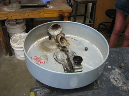 Next, plaster is made and poured over the mold into the flask. I forgot to take pictures of this! Anyway, the flask is put into a kiln and heated for 5-8 hours. This is called the burnout. During this time, the plastic monkeys and wax sprues melt while the plaster hardens around them leaving the image molded. Now, the fun begins. First, we set up the centrifugal casting machine. This will use force to thrust the melted metal into the flask.