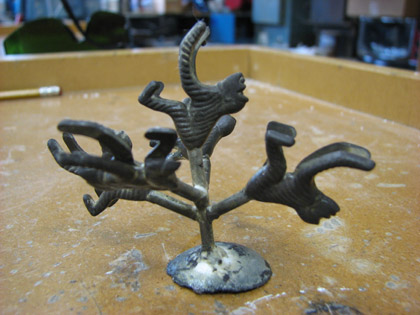 Next, the flask is plunged into water where the plaster dissolves leaving you with your casting. If all goes well, you should have an exact replica of what was sprued in the beginning. Because I cast in silver, the piece is dark grey due to oxidation. Now I have to cut the monkeys off the sprues and the clean up begins!