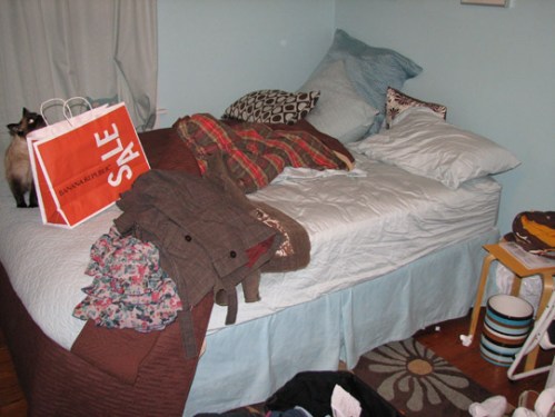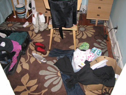 Our house is already trashed due to all the packing we’ve been doing over the last week, but my sister knows how to add to the chaos. She arrived late Friday night to attend her HS reunion and stayed with us since mom and Burl were out of town. I always love spending time with my sister, but it’s amusing how such a small person can take up so much space. For example, here’s how our guest room floor looked during her visit (ok, the cowboys boots are mine, but everything else is hers):