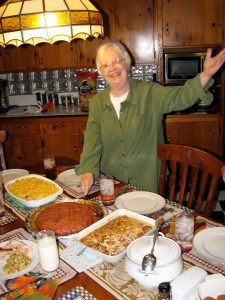 Karen, my dad’s wife and my other mom, was such a good sport this weekend! Unbeknownst to us, she had already bought the Thanksgiving meal of smoked turkey and ham. When she mentioned that’s what she was planning to serve, we all protested that what we really wanted was ham loaf. Now, Karen’s given us the recipe for ham loaf so we can make it any time, but she does the best job at it. It’s one of those things we really love to have when we visit. Being a good sport and stand up person, Karen indulged us and made a gorgeous ham loaf to accompany her homemade mac and cheese, green beans and sweet potatoes. Here’s Karen making the first cut into that delicious, meaty loaf: