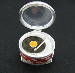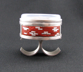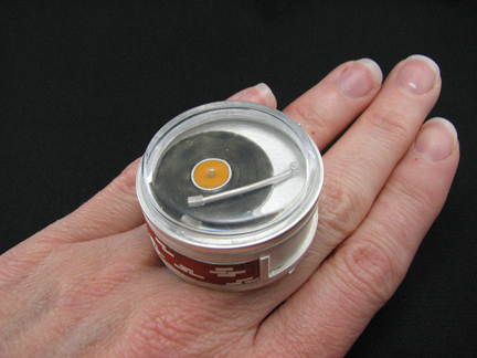 Because the ring had to include enamel, I decided to enamel a tiny record and a speaker front. Slowly the design began taking shape, but it wasn’t without its problems. First, I wrecked the original turntable top. I had misaligned the rim with the top when I soldered it at school and couldn’t get it corrected. So I made another one. Then, the enamel started giving me problems. Some enamels don’t work well when fired directly onto silver and orange/red is one of them. Of course, that was the color I wanted on the speaker. I fired that darned thing so many times I really thought I’d have to start over. It’s not perfect, but it looks good. Finally, there was the hinge. Hinges are tricky because they require precision in order to work correctly. When they are done on a flat surface, they are fairly easy to line up and solder. When they are done on a curved surface, it’s another story entirely. I did a sample and got it to work after three attempts. I felt pretty good about doing it on the real piece. That feeling didn’t last long. I made seven attempts before finally getting it to work. I slightly warped the top, but was able to correct that. As I was reshaping the bottom piece, one of the hinges (or knuckles as they’re called) fell off. Grrr. Two more solderings and it was on. All together I had nine attempts on the darned thing. And it’s not perfect, but it works and that’s good enough for me.