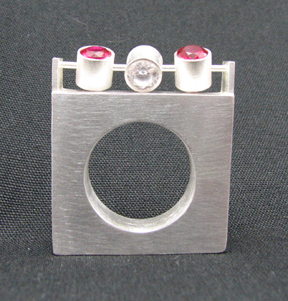 I went home determined to carefully measure all my parts to insure this ring would be a success. I filed my tubes perfectly straight. I used both digital and manual calipers to measure my pieces and mark my holes. I cut the seats for my stones and they fit perfectly. I was feeling really good about things. I put the ring together, soldered the bar that held the tubes in place and cleaned up the entire ring to prepare it for the stones. Then I set the first stone. Hmm, it wasn’t setting right. Guess who forgot to measure the depth of the stone? Dammit! Well, there was no turning back since I had no room to raise the bar so I had to make it work. To the untrained eye, it looks good. To me, and anyone who’s ever set a stone, it’s a mess. But I’m pleased with the outcome anyway.