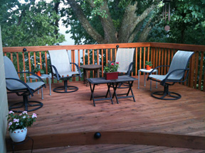 We had a lot of great advice. Mom and Burl had done their deck a couple of years ago and Pavel does decks all the time so everyone had tips and tricks for us. We learned that the worst thing you can do to your deck is apply a waterproof sealer which, of course, is what the previous owners did. The sealer bakes in the sun and turns to resin making it impossible to remove unless it starts to flake or you sand it. Power washing will only take you so far in topcoat removal. Steve power washed the deck between rainstorms then used a power sander to get the rest of the crap off. It was a grueling process. In the meantime, we found a great deal on stain, chose a redwood semi-transparent color and got ready to go. Steve spent a week ago Saturday working on the front deck because he figured he could make mistakes on it and learn the staining process before tackling the back deck, which is where we spend all our time. Pavel had suggested he use a simple 1 gallon weed sprayer to apply then go over it with a brush. It worked well. On Sunday, I took over the tedious task of painting the railing. The entire time it took me to paint what little railing we had on the front, Steve took to sand the rest of the back deck. Whew! This was getting tiring!