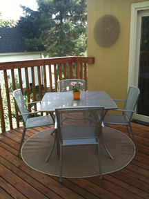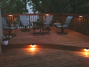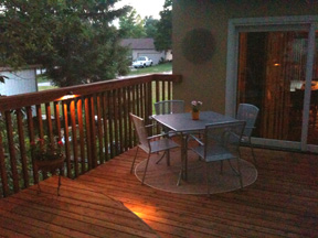 Fast forward to this past Saturday. Steve had worked throughout the week staining the back deck and had taken some advice from yet another source to get a painter’s mitt to stain the railing. By Sunday morning the deck was stained, railings and all. But wait, there’s more. The finishing touch would be installing low-voltage accent lights around it so we’d have light at night.