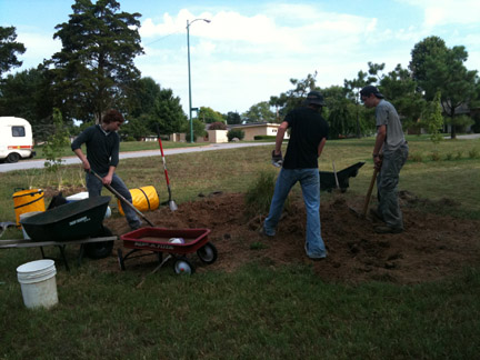Nothing like a few teens with pickaxes attacking an unwanted berm to start my week off right! They were so thrilled I was taking their picture that Tracy had to yell at them to get back to work. In about two hours, the whole thing was gone, the weed barrier was in a pile by the trash and the extra dirt had been taken over to an area we call Stonehenge to fill the eroded places. On top of that, while one crew had been tackling the berm, another kid had been trimming trees and pulling up ivy in the area outside my studio. Wow, this place was starting to look really good!