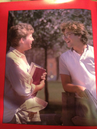 This photo is from a Drury College (as it was then) Admissions catalog. I believe this is the fall of 1985, but it might have been the spring of 1986. I was dating the guy pictured, Steve W., and he worked in the Admissions office. They needed some Drury students to pose for their upcoming catalog so he asked me to be a part of it. I think it’s the happiest I ever looked in college! Ok, so the nerd part is that I can tell you the details of my “fabulous” outfit. The shirt was a peach cotton shirt from The Limited and I adored it. I wore it until it faded and fell apart long after college. The shorts are Liz Claiborne shorts my Grammie bought me on a shopping trip in Columbia. Yes, I was stylin’ in those days.