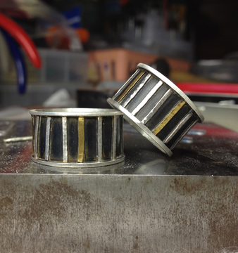 Tonight we’re planning a nice meal out (a treat for us) and we’re going to celebrate by getting dressed up and making the meal an occasion. Yes, I’m actually going to wear a dress. I’ll take photos. This morning, we exchanged gifts and I was excited to give Steve something I’d been working on for the past two weeks. Actually, it’s something for both of us since I made myself one too. I made us matching rings symbolizing our 16 years together. The ring band is steel and the lines are sterling silver and 22K gold. There are 16 lines with the 4th line being the 22K gold. The rims are sterling. I think they turned out pretty well and Steve loved his.