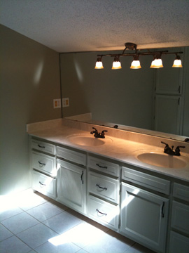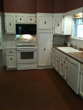 The dining room and den were uneventful. Both rooms were painted neutral colors and looked about the same. The kitchen has changed somewhat, but I was surprised to see the same cabinets and hardware we had when we lived there. The only difference was they had been painted. The kitchen floor was carpeted – a very chic thing to do in the 70s – but that was fortunately gone. I’m not sure I love the tile, but it isn’t horrible. The other thing that had changed was the removal of the back porch to extend the kitchen. It made the room larger and more inviting.