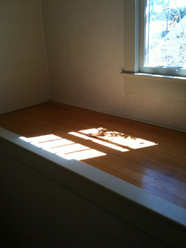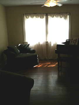 Still, the living room, with it’s deep wood floors, looked fresh and clean (and smaller than I remember). Here’s a pic of the other side. My upright piano used to be against the wall and we’d put the Christmas tree in the window where this baby grand piano is now.